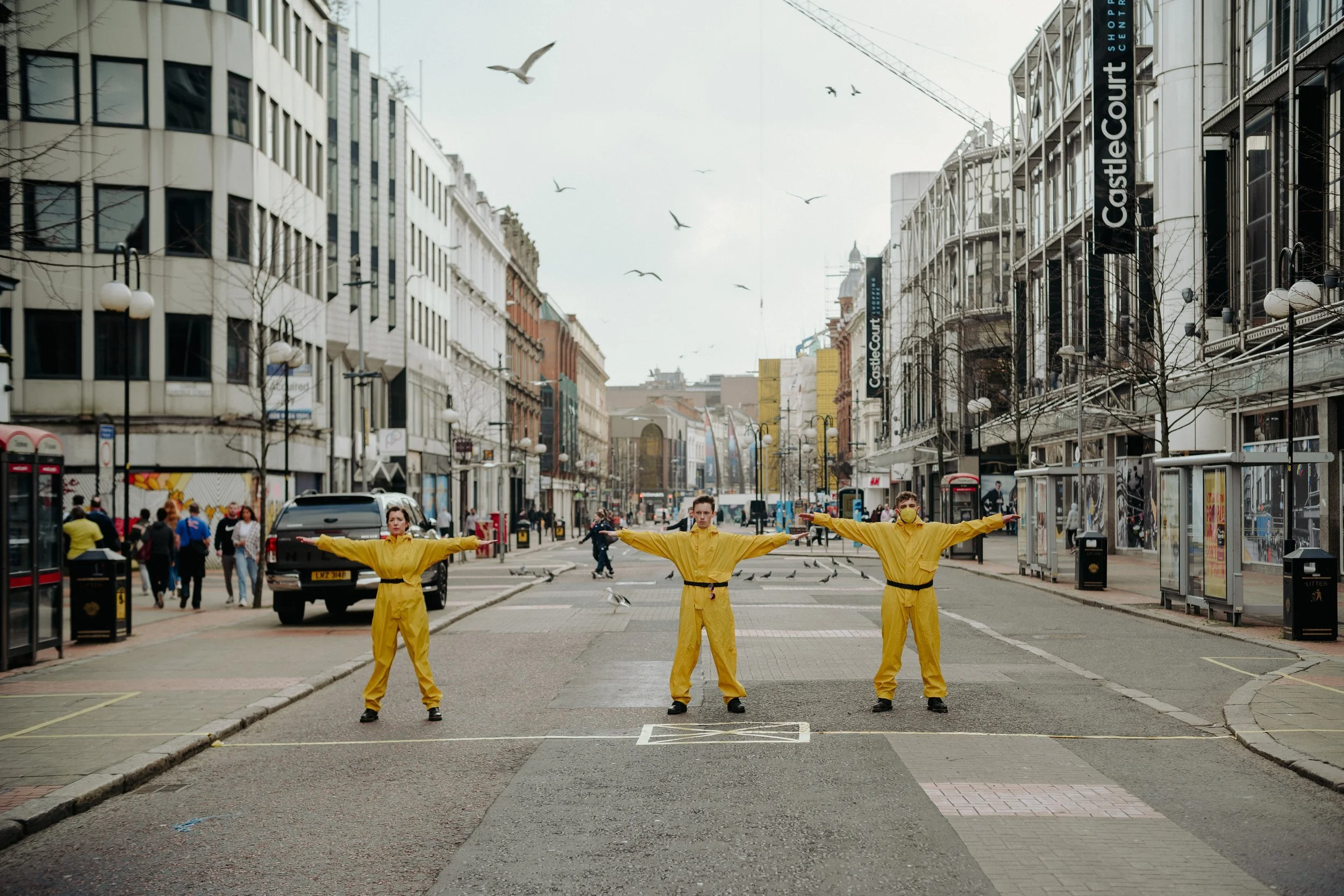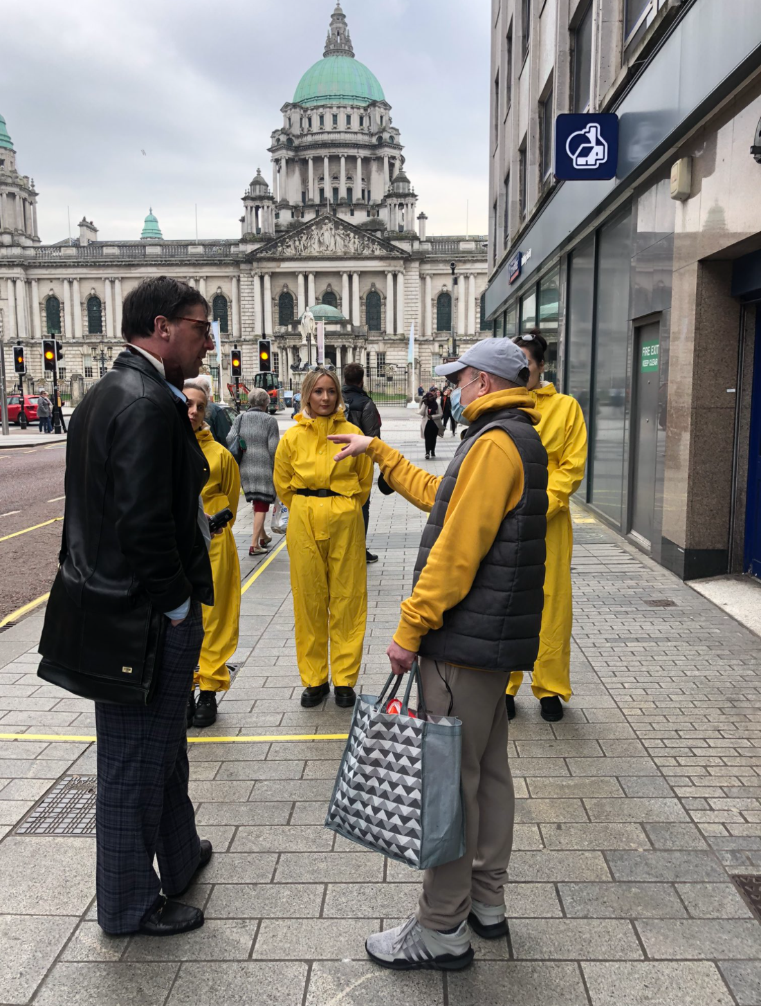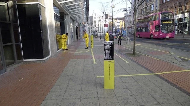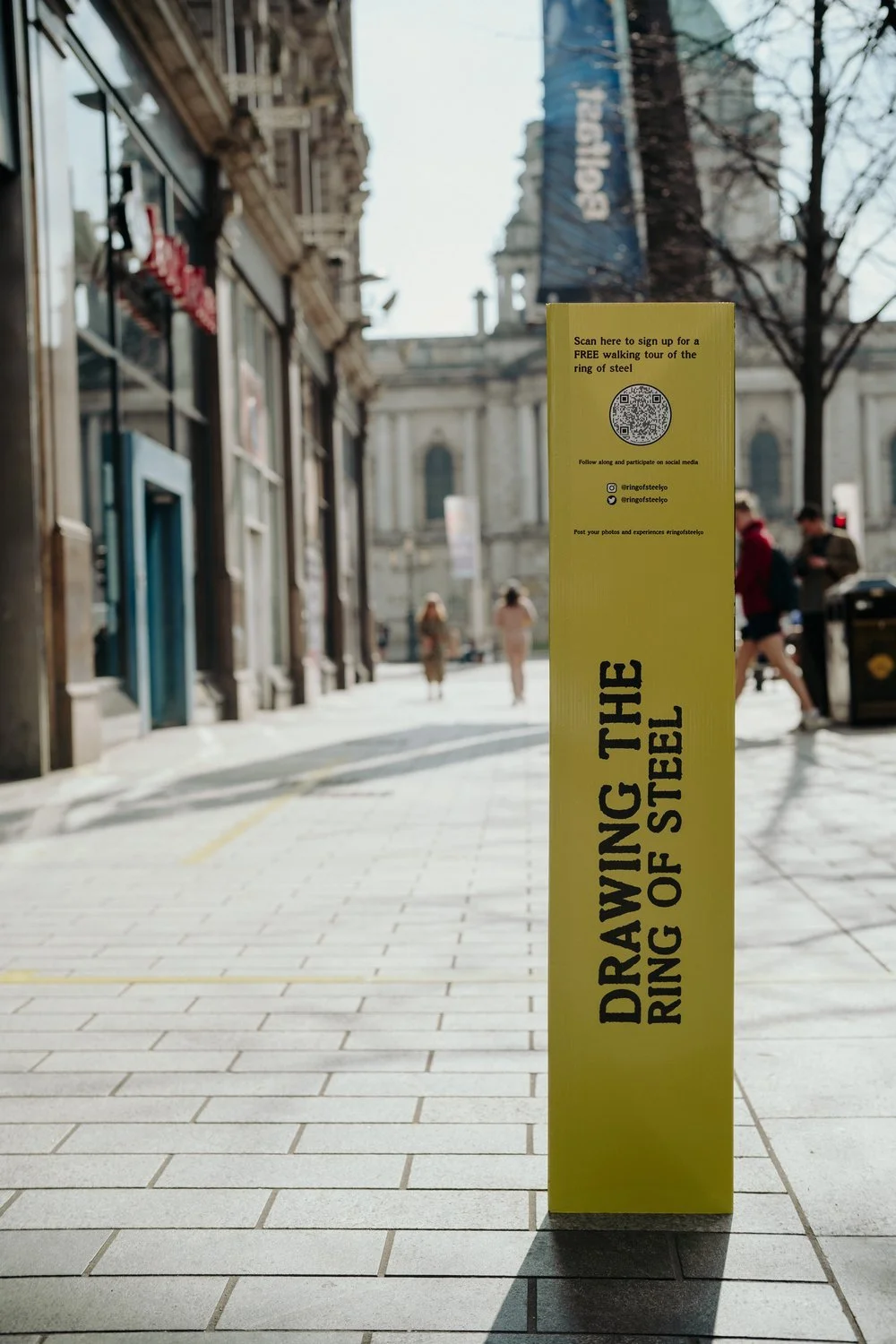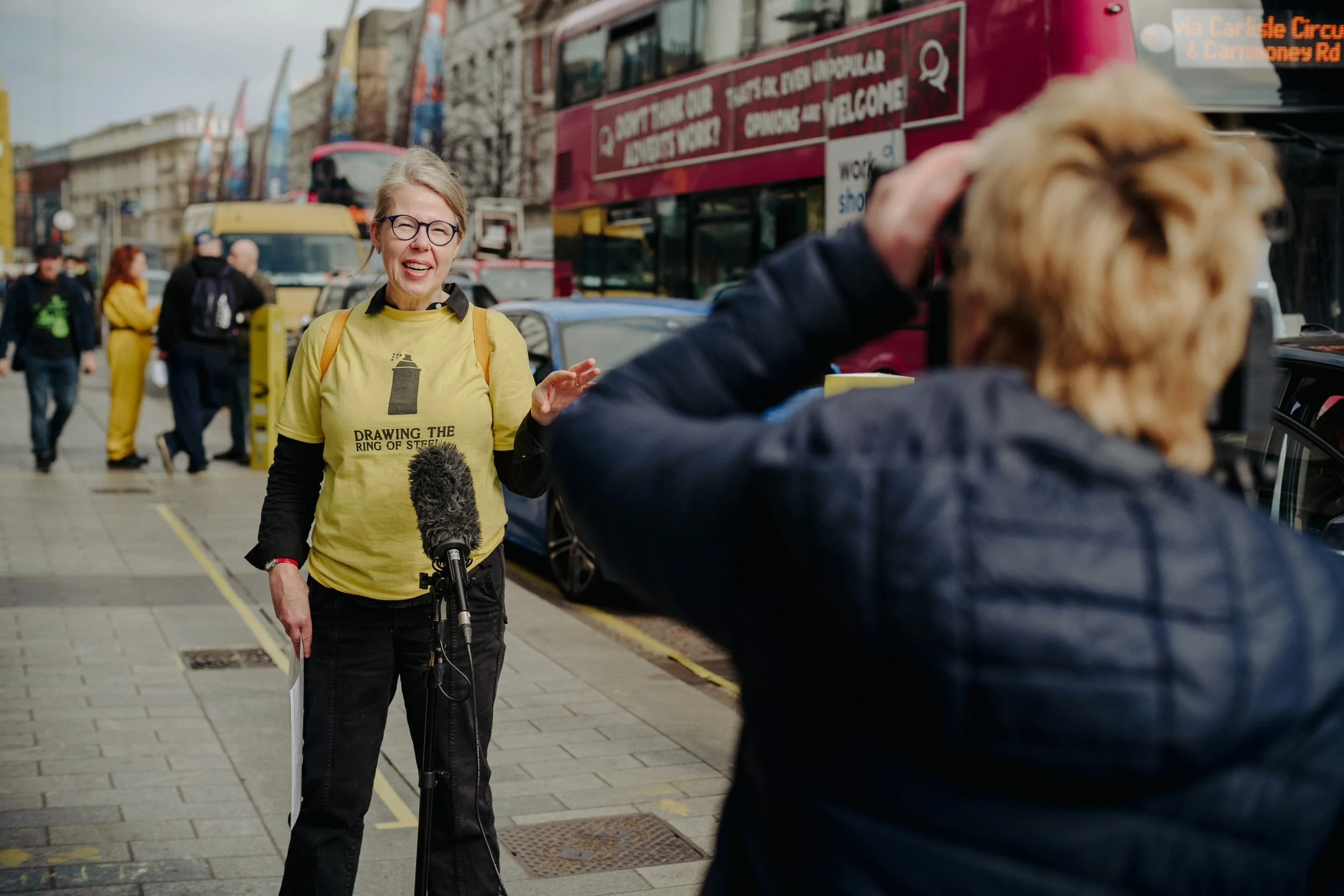 Drawing the Ring of Steel was a durational commemorative event that took place in Belfast on March 24, 2022. The event was co-directed by Kate Catterall (Assoc. Prof. Design, University of Texas at Austin) and Paula McFetridge (Artistic Director, Kabosh Theatre, Belfast and took place fifty years after the initial construction of the historical security cordon, known to the British Military as the ring of steel. The event was designed to recall memories of a 2.2-mile security cordon that surrounded the city center during the Troubles, an ethno-nationalist conflict in Northern Ireland (1969-72). The security cordon was selected as the site of commemoration because the experience of being searched to enter the city center, a policy that rendered all Belfast’s inhabitants suspect, was one of few common experiences of the Troubles.